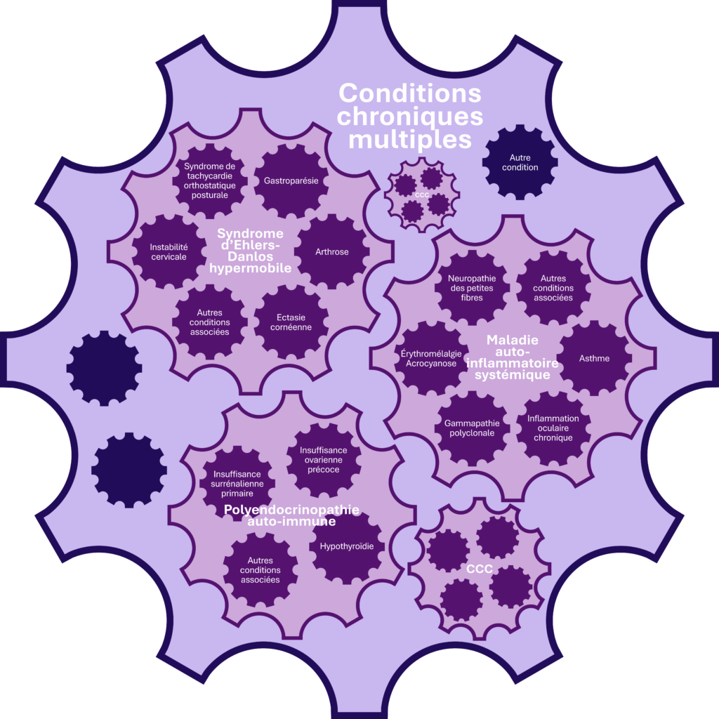 Dans les conditions chroniques complexes (CCC), différentes conditions sont associées par des liens cliniquement pertinents, sans nécessairement de lien hiérarchique, et les chevauchements de symptômes sont fréquents. Cette représentation peut permettre de mieux cerner et comprendre le tableau clinique, tout en permettant d’aborder la complexité un engrenage à la fois.