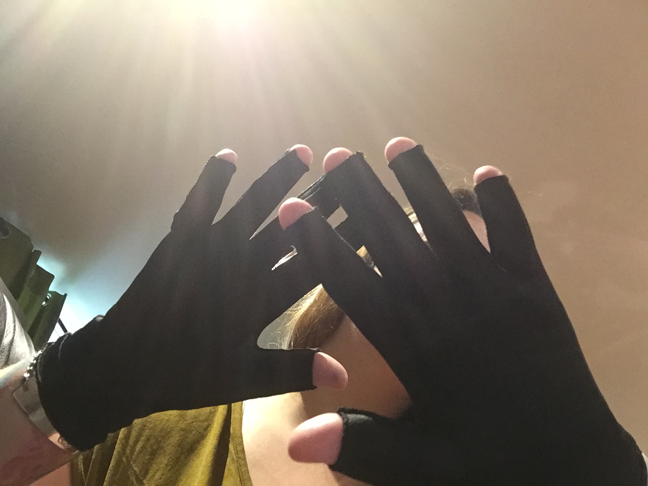 Je dois ajouter que porter des gants comme ça tout le temps n’est vraiment pas pratique ni hygiénique. Quand on a un système immunitaire pourri, comme moi, qu’on doit souvent se laver les mains, c’est pas idéal d’avoir du tissu qu’on ne peut pas laver souvent (même si je les lave tous les jours… même si je les enlève avant d’aller aux toilettes… j’aurai serré la main de quelqu’un, touché au panier d’épicerie, flatté le chat, etc.) C’est vraiment pas pratique pour préparer les repas non plus. En prime, j’ai déjà de la difficulté avec ma motricité fine, mais si en plus j’ai ces gants compressifs, j’ai de la difficulté à bouger mes doigts, alors j’échappe tout. Et si je force pour serrer les doigts, ça me coupe la circulation (syndrome de Raynaud, encore et toujours).
