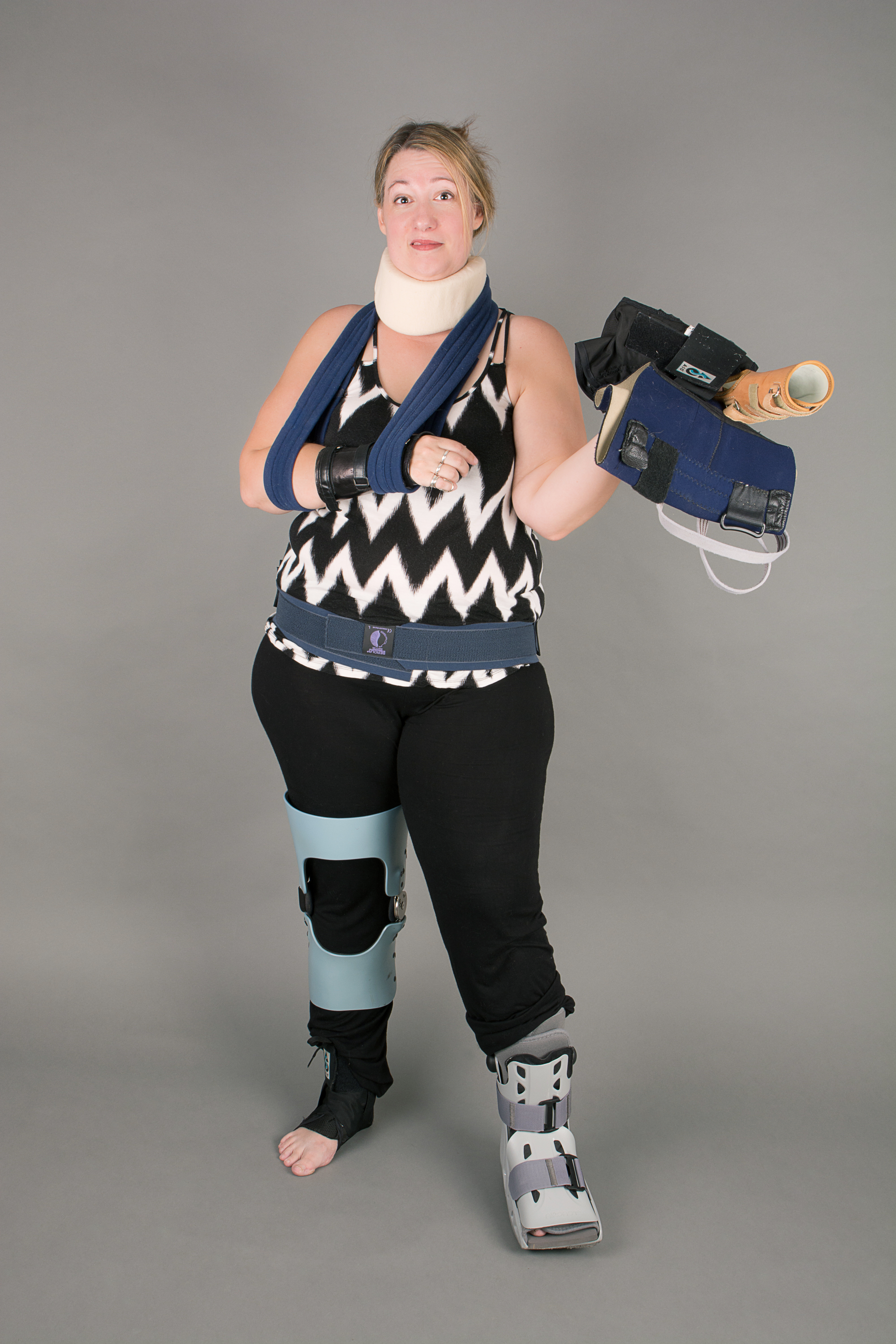 Deuxièmement, parce qu’en général, porter une orthèse crée des problèmes secondaires. Quelques petits exemples : porter l’orthèse de genou bleue rigide me blesse la peau des deux jambes, me force à marcher et m’assoir différemment, et je finis donc par me blesser à l’autre jambe aussi. Après quelques heures à porter mes bagues, je finis habituellement par enfler et devoir les enlever. Supporter mon bras en écharpe suite à une dislocation me blesse au poignet (sans compter les blessures en raison de la compensation de l’autre bras).