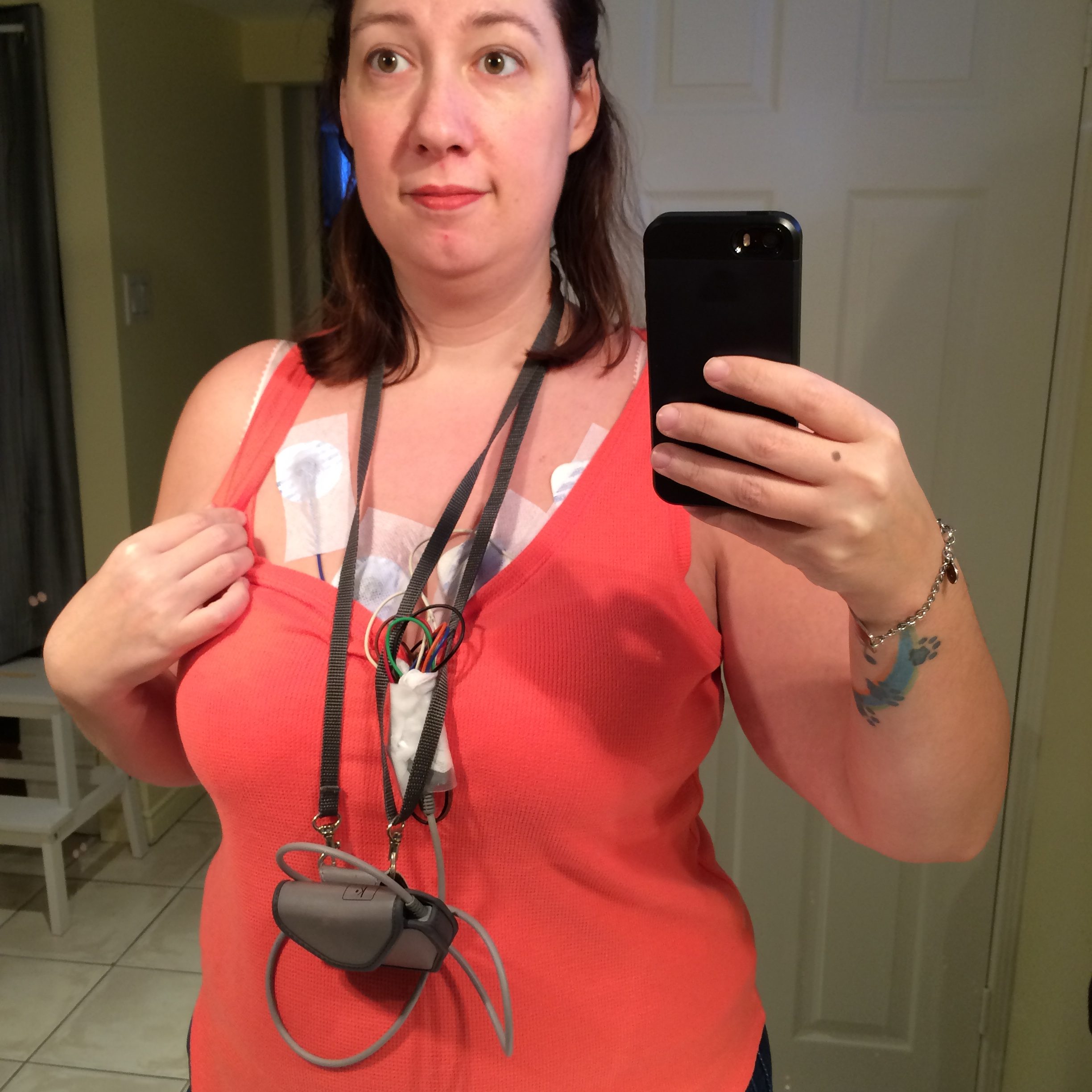 Après le test, on m’a installé un moniteur Holter pour 24hrs. C’est le moniteur qui prend une mesure chaque 20 minutes le jour, puis chaque heure la nuit (si je me souviens bien?). Il faut jouer à « statue » dès que la machine fait « bip! » parce qu’elle n’arrive pas à prendre de mesure quand on est en mouvement. Il faut aussi noter ce que l’on est en train de faire au moment de la prise de mesure, et les médicaments qu’on prend au cours du 24hrs. C’est bien dommage qu’on ne puisse pas prendre sa douche avec ce truc, puisque c’est entre autre là qu’on verrait beaucoup de résultats avec moi!