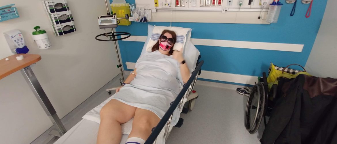 Alors nous voilà partis à l’hôpital, mon père, mon chéri et moi. Je rappelle que j’avais eu ma chirurgie oculaire à l’oeil droit deux jours avant! Et que j’ai le ligament de la cheville gauche déchiré. J’arrive donc là avec mes grosses lunettes soleil (il faisait noir depuis longtemps), mon masque pour me protéger des infections et en fauteuil roulant. Tout un phénomène…